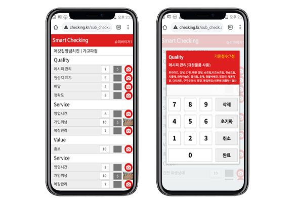 점검관리 가맹점 QSCV 관리하나의 프랜차이즈 브랜드를 만들고 발전시키기 위해서는 어디서나 똑같은 서비스와 인테리어, 위생, 맛을 구현해야 합니다. 프랜차이즈나라의 점검관리는 사진 첨부를 통해 투명하게 가맹점을 관리합니다. -